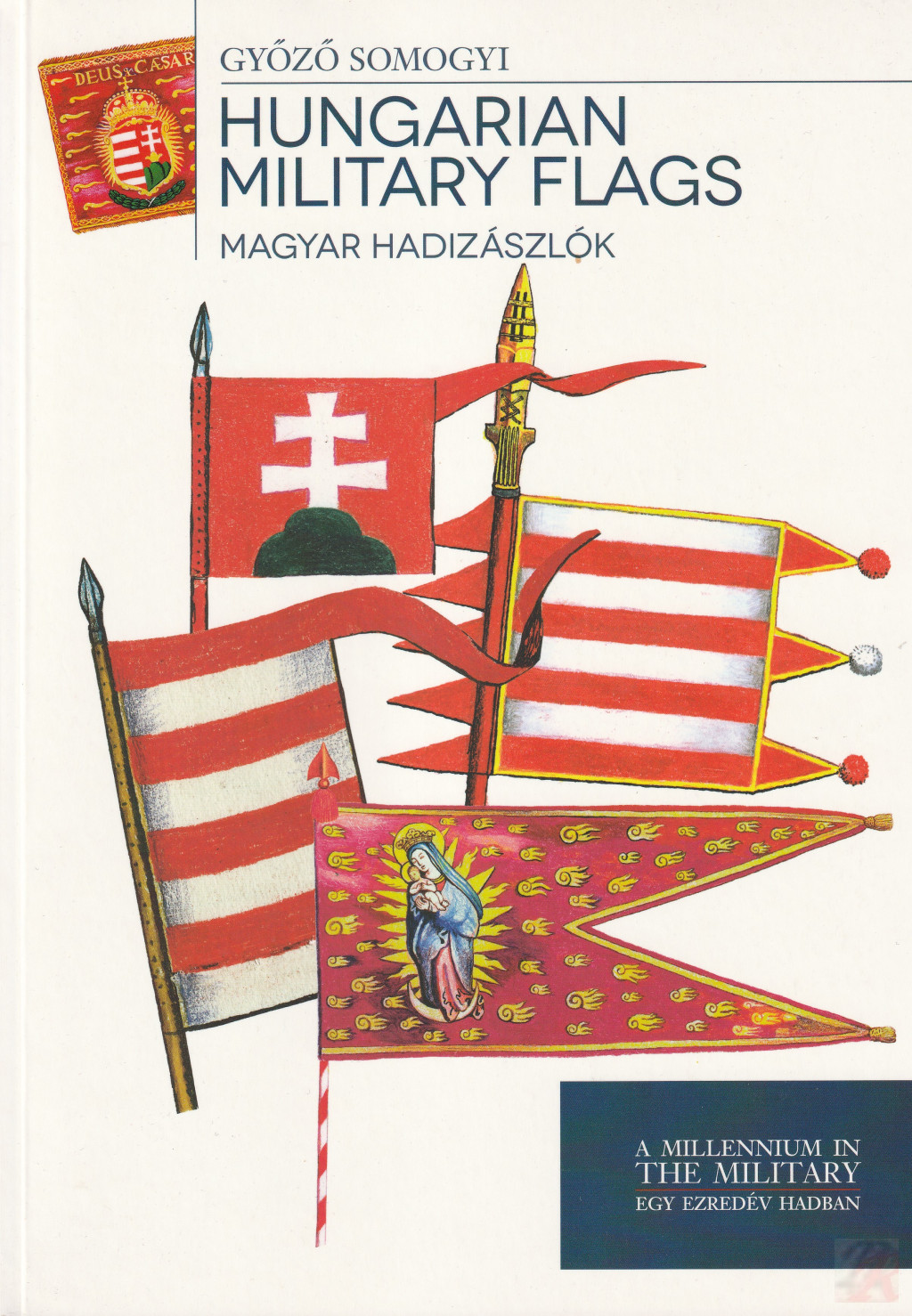 "A magyar hadizászlóknak a Kossuth-díjas szerző által e kötetbe rajzolt története exkluzív módon jeleníti meg Magyarország históriáját 800-tól napjainkig. Három jól elhatárolható korszakot vetít elénk: Az ősmagyar zászlók (800-1000) az Atilla-nemzetség fő zászlajának turul totemállat-ábrázolásától a fejedelmi Árpád-dinasztia vörös-ezüst sávos jelképéig terjedő korszakát, majd a Magyar Királyság (1000-1800) időszakának keresztény szimbolikáit. E korszak fő zászlómotívumai a vörös-ezüst Árpád-sávok, a vörös alapon zöld hármas halmon álló apostoli kettős kereszt, valamint Szűz Mária, a Magyarok Nagyasszonya. Végezetül a XVIII. század vége, amikor is megszületett háromszínű zászlónk, a nemzeti trikolór az addigi címer vörös-ezüst-zöld színeiből. Ennek címeres állami, címer nélküli nemzeti és farkasfogas katonai változatai jelentik a magyar zászlót napjainkig. Az eredeti szemlélettel, művészi látásmóddal alkotott mű az ""EGY EZREDÉV HADBAN"" sorozat legfrissebb tagjaként a szimbolika, vexillológia felől közelítvén bontja ki teljességében a magyar történelmet."